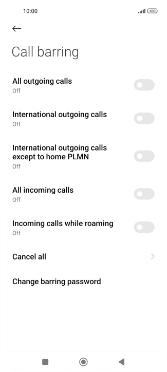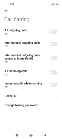 Press the indicator next to the required barring type to turn the function on or off.