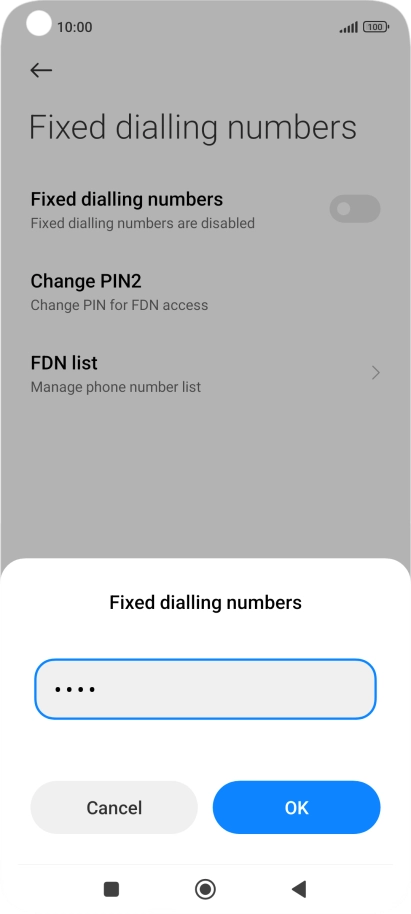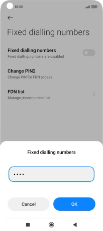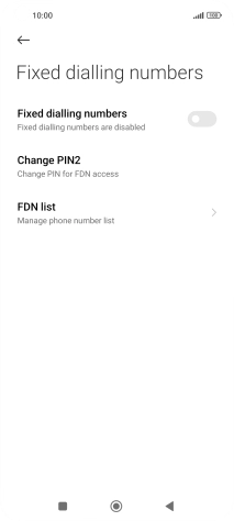 Press the indicator next to "Fixed dialling numbers" to turn fixed dialling on or off.