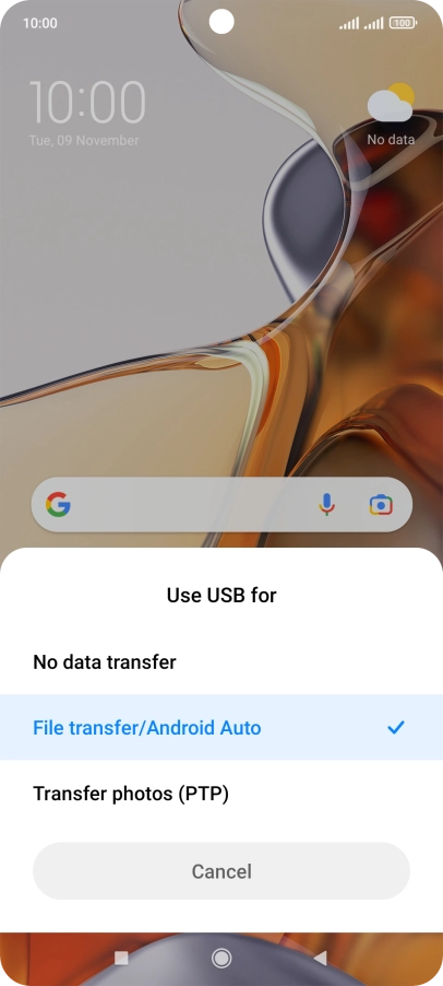 Press File transfer/Android Auto.