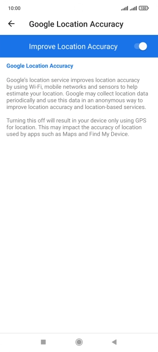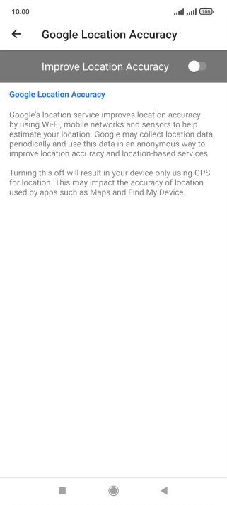 If you press the indicator next to "Improve Location Accuracy" to turn off the function, your phone can find your exact position using the GPS satellites but it may take longer as there is no access to supplementary information from the mobile network or nearby Wi-Fi networks.