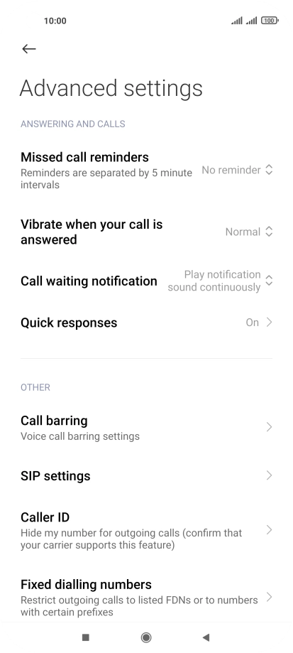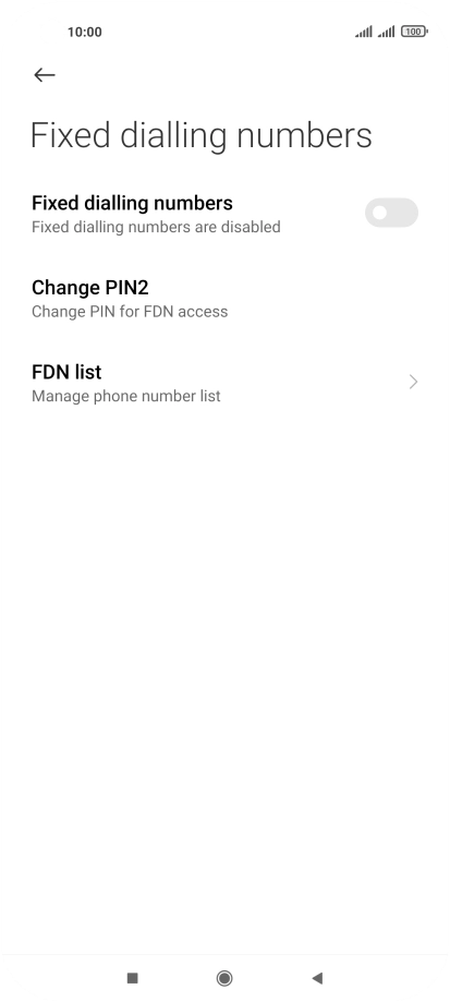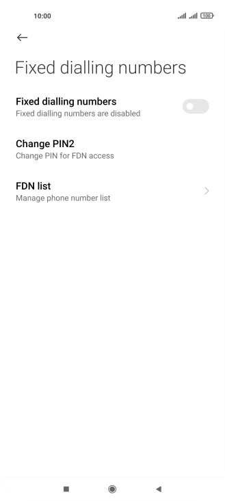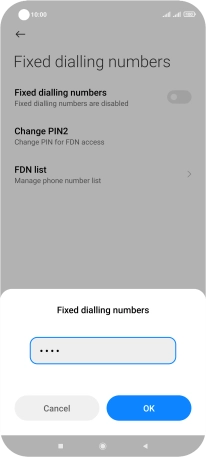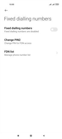Press the indicator next to "Fixed dialling numbers" to turn fixed dialling on or off.